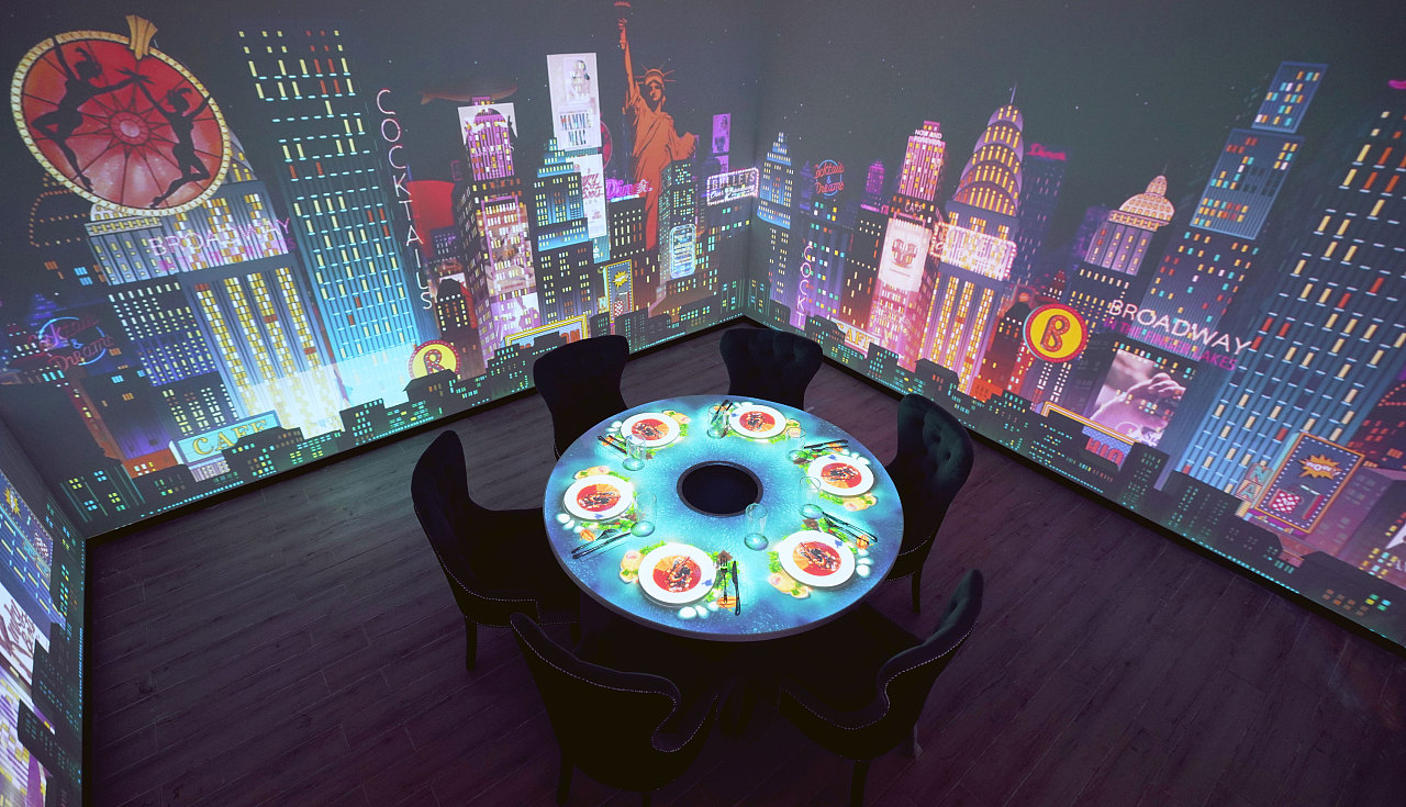 一家别具一格的主题餐厅,一次身临其境的用餐体验。3D全息技术可投影出不同风格的画面,打造出不同主题的餐厅。