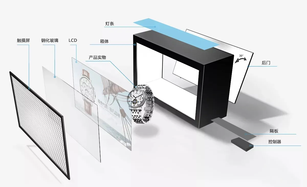 透明屏展示系统主要分为两部分,PANEL和背光源PANEL:画面形成部分,主要分为像素层,液晶层,电极层(TFT);画面形成:逻辑板将信号板发送来得图像信号,进行逻辑运算后,输出控制TFT开关,即控制液晶分子的翻转动作,从而控制让背光源发的光是否透过,照射相应像素,而形成让人们看到彩色的画面。